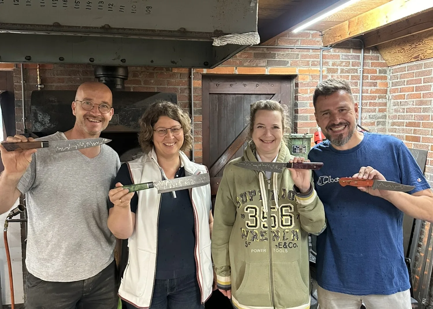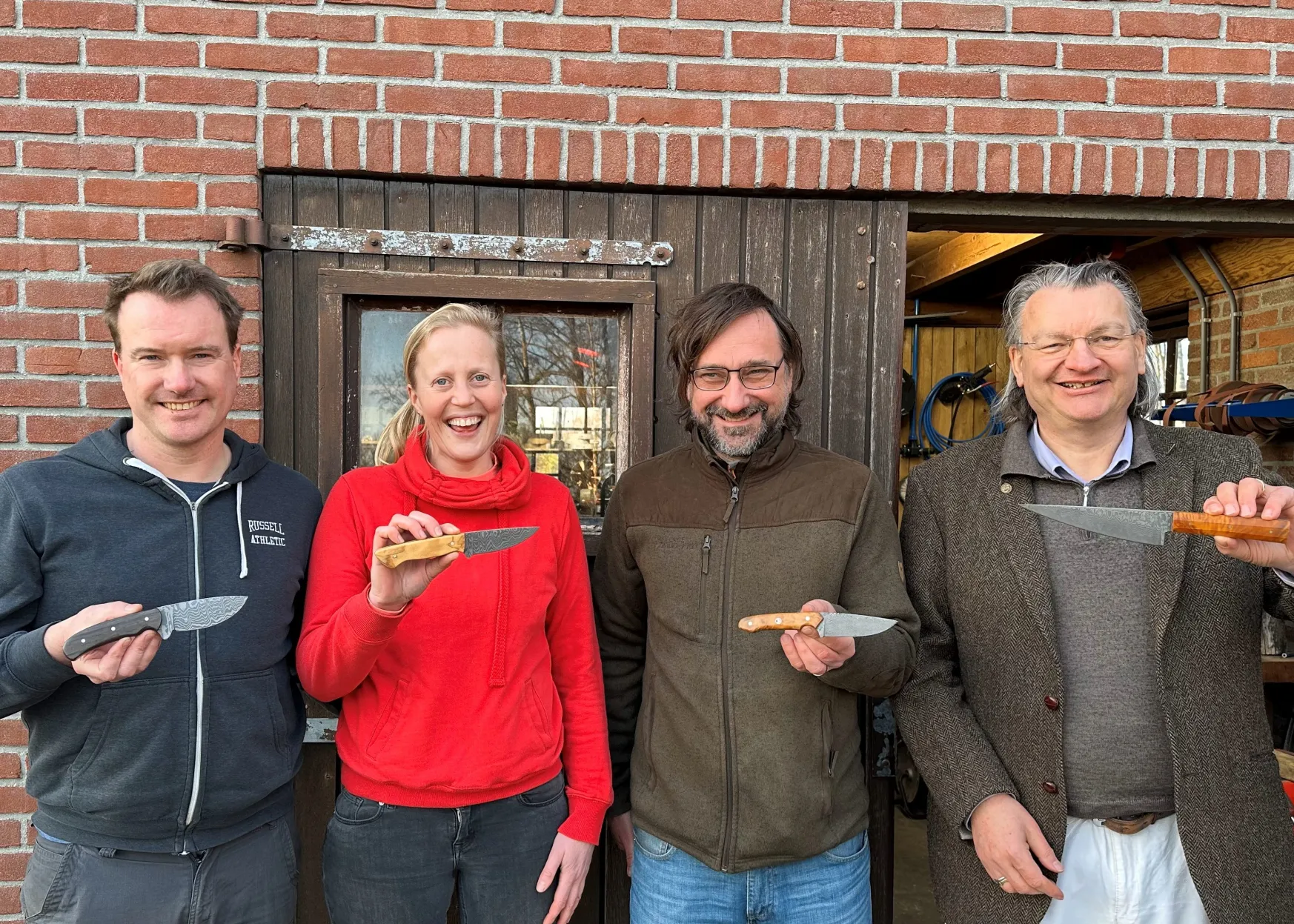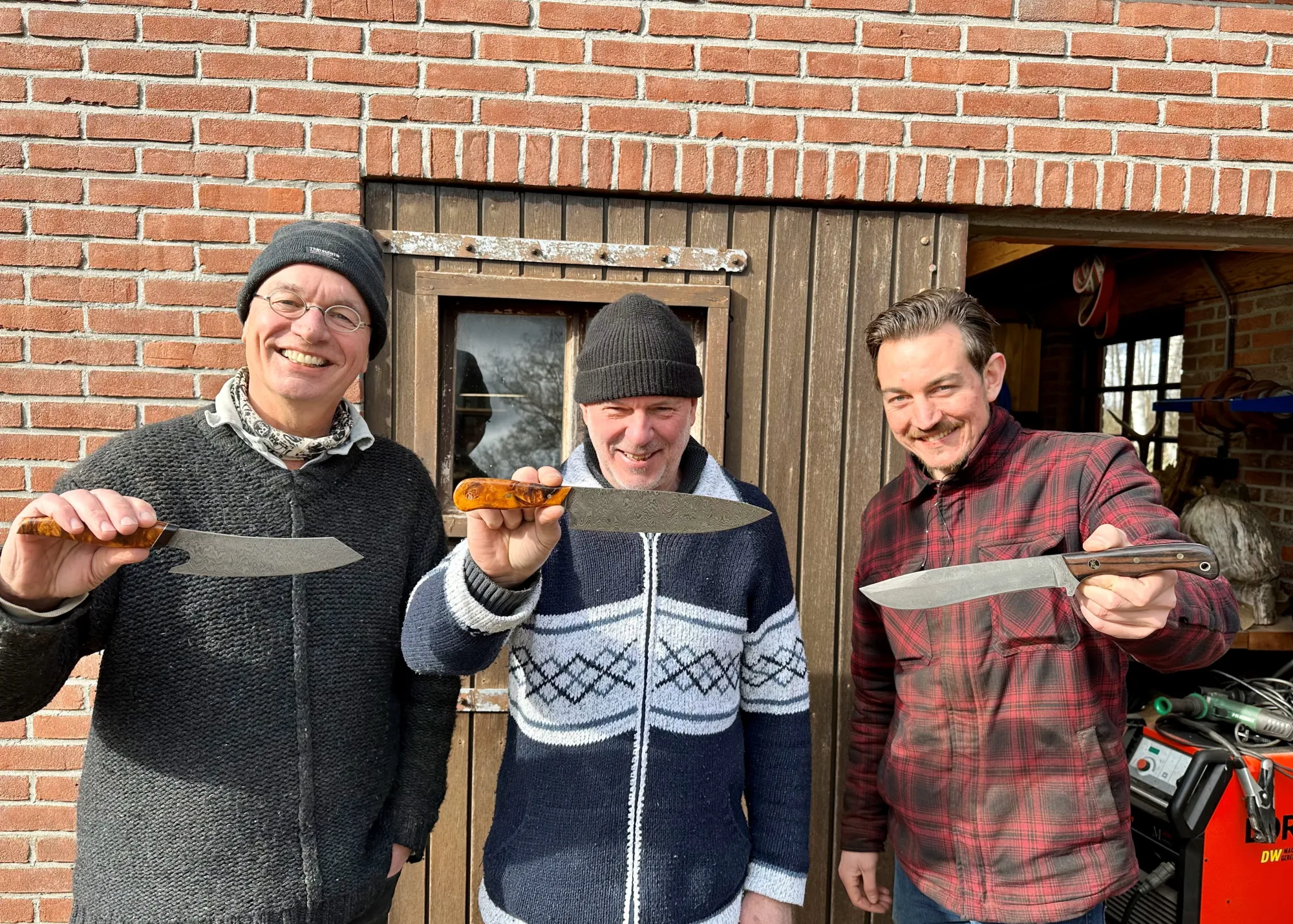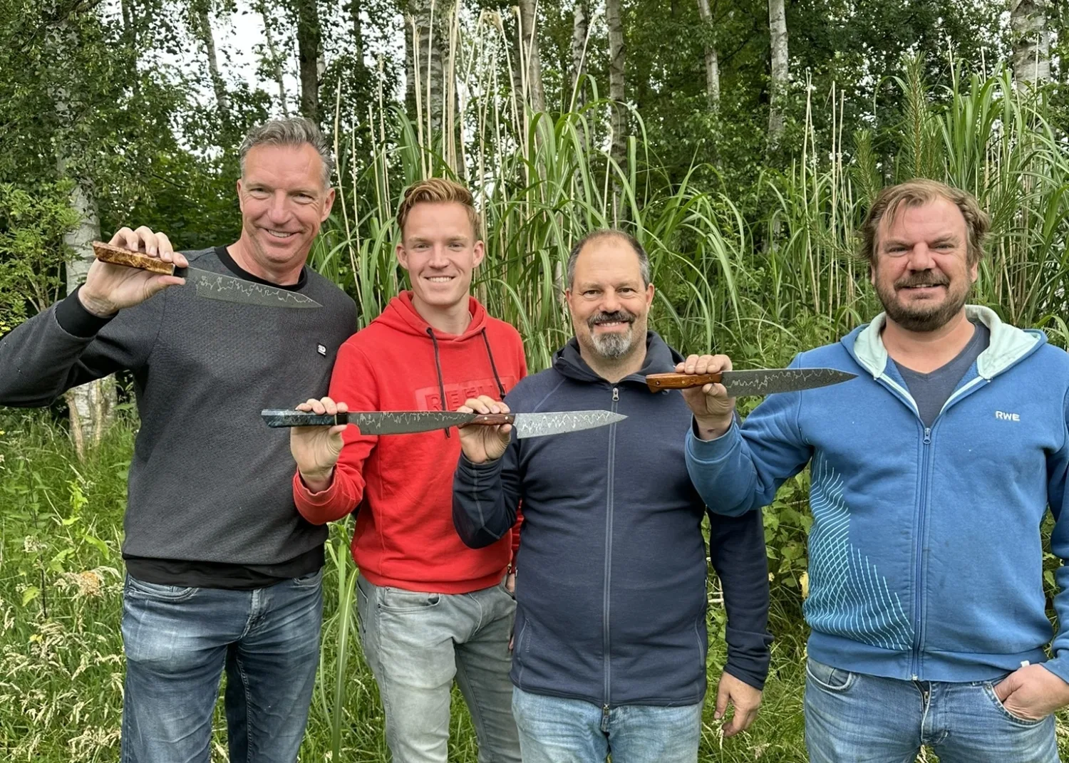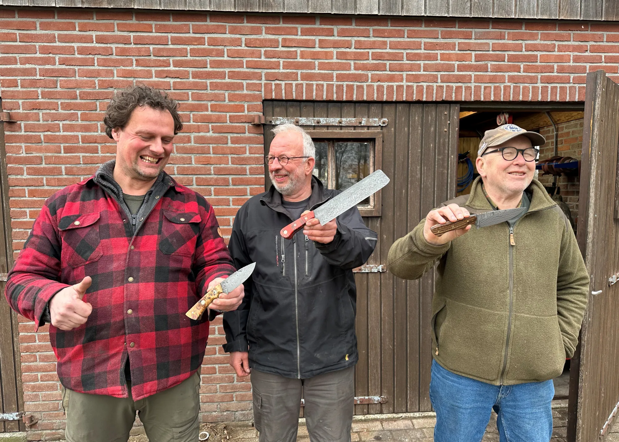 Deze smeden gingen u voor en presenteren hier hun zelfgemaakte mes. Iedereen vol enthousiasme over het smeden, de omgeving, de lunch, de verzorging en het prachtige resultaat. Zeker het van A tot Z zelf mogen doen werd gewaardeerd.