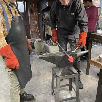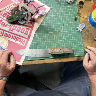 We gebruiken hoogwaardige gereedschapstalen om uw eigen damastpakket samen te stellen. Vervolgens worden deze op temperatuur gebracht en met behulp van hamer, aambeeld en onze luchthamers tot een pakket gevormd. Dit pakket vouwen we verschillende keren om te komen tot het gewenste aantal lagen. Deze dag beleeft u het oude ambacht en de hitte die nodig is om het staal te smeden.