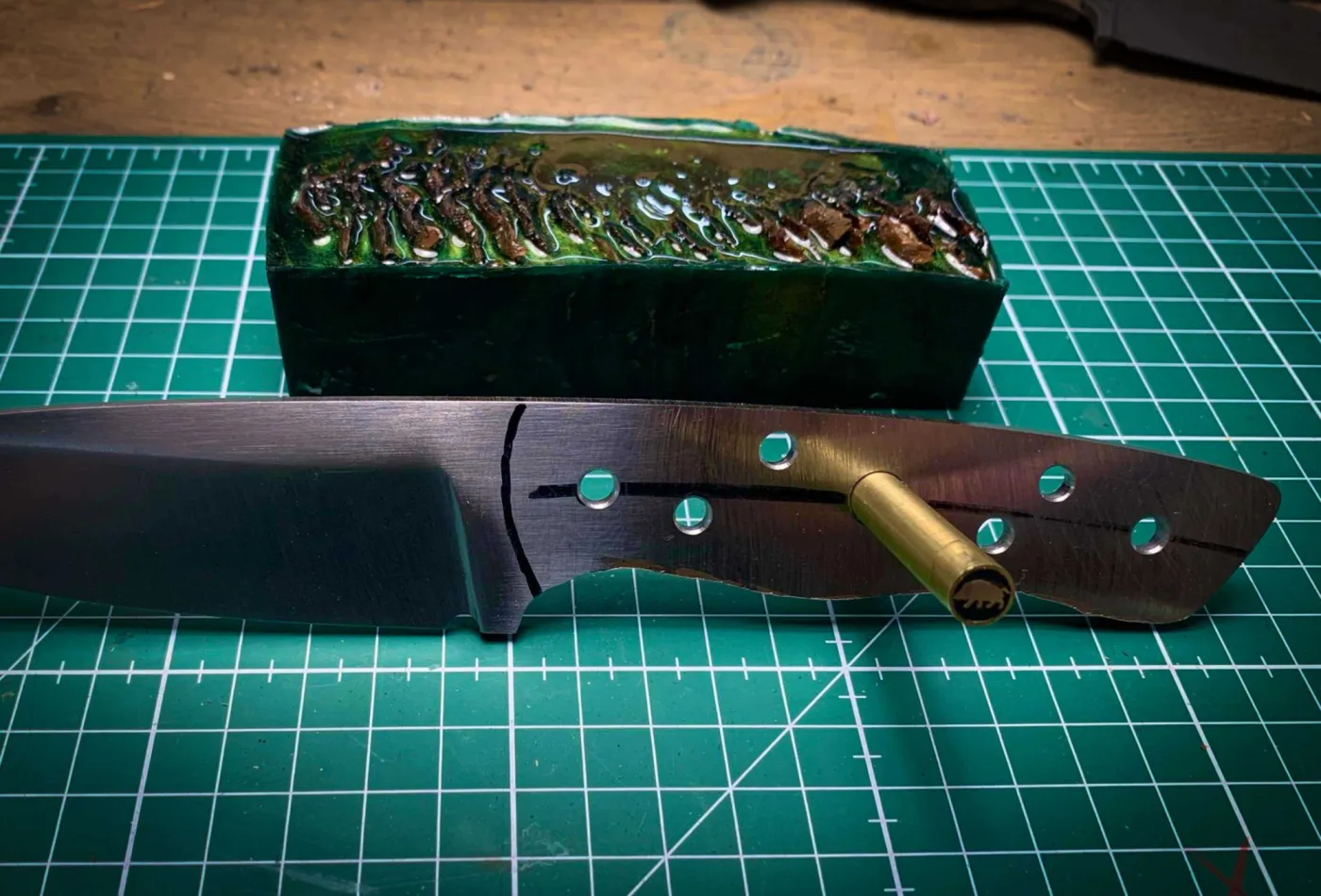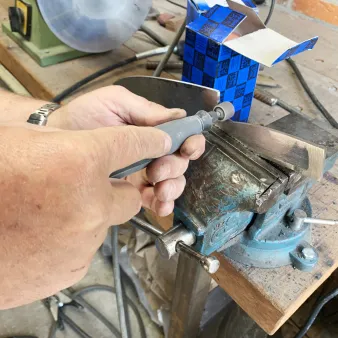 Met de hand wordt middels vijlen en schuren de juiste finish aan het mes gegeven. Nadat de gaten geboord zijn voor de bevestiging van het handvat voeren we een optimale warmtebehandeling van het staal door zodat een optimale hardheid wordt verkregen. Na het harden ontlaten we het staal in de oven. Gedurende dat het mes in de oven ligt gaan wij genieten van een heerlijke lunch.