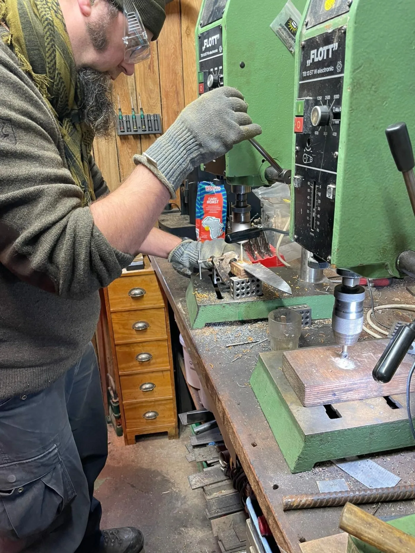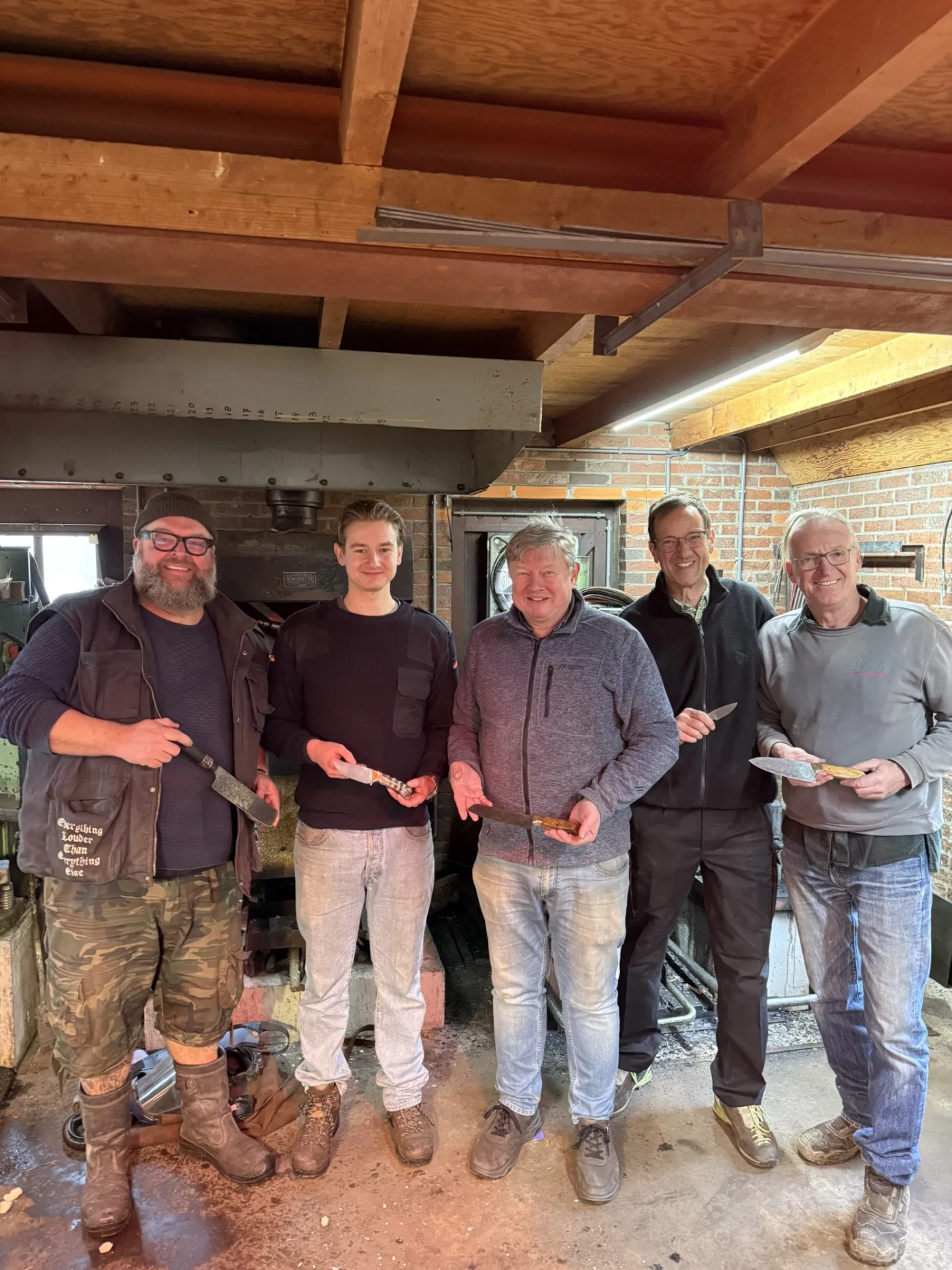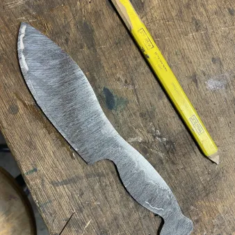 De tweede dag van de PLUS SMEEDCURSUS maken we het feitelijke mes. Eerst tekenen we de vorm van het mes en zagen en slijpen de contouren in vorm. Daarna maken we het perfect vlak en tot de exact de gewenste dikte met behulp van een komslijpmachine en vlakslijpmachines. Met behulp van moderne bandslijpmachines slijpen we het lemmet. In principe mag iedereen deze handelingen zelf doen. Voorkennis is niet noodzakelijk. We maken gebruik van slijpmallen waar mogelijk. Wel staan we continue aan jullie zijde zodat we kunnen ondersteunen waar mogelijk. Uitgangspunt is dat iedereen met het perfecte mes naar huis gaat. Met de hand wordt middels vijlen en schuren de juiste finish aan het mes gegeven. Nadat de gaten geboord zijn voor de bevestiging van het handvat en eventueel een krop voeren we een optimale warmtebehandeling van het staal door. Na het afschrikken in speciale hardingsolie ontlaten we het staal zodat het taaier wordt. Hierna wordt het mes geëtst waardoor het unieke damastpatroon zichtbaar wordt. De rest van de middag besteden we aan het voorbereiden van het handvat.