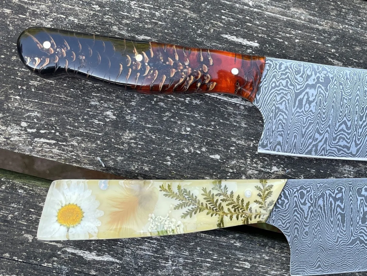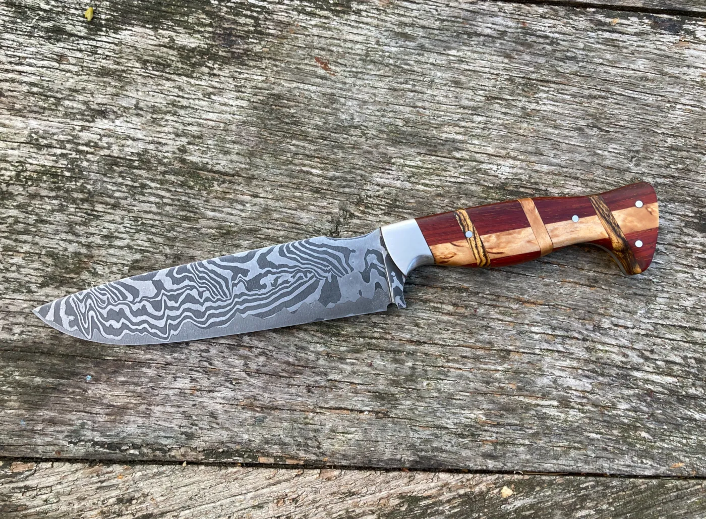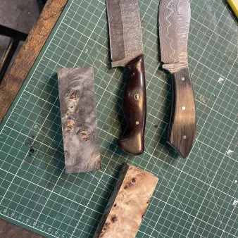 Inclusief bij de PLUS DAMASTSMEEDCURSUS zijn luxe houtsoorten, gestabiliseerde houtsoorten, mozaïekstiften en één symboolstift naar keuze. Monteren (klinken) van messing of rvs krop aan het mes is eveneens mogelijk.
