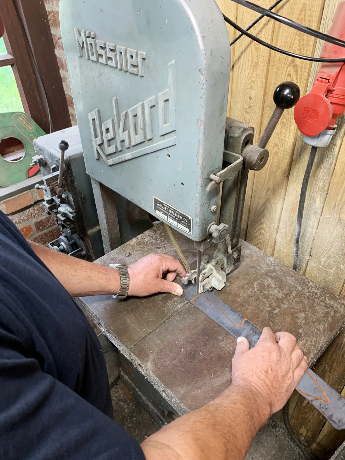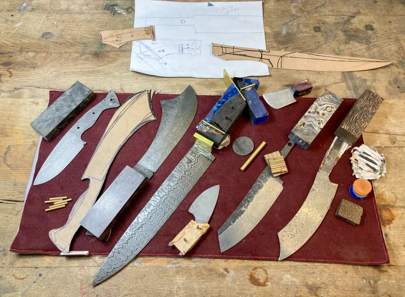 Deze dag van de PREMIUM SMEEDCURSUS maken we het feitelijke mes. Eerst tekenen we de vorm van het mes en zagen en slijpen de contouren in vorm. Daarna maken we het perfect vlak en tot de exact de gewenste dikte met behulp van een komslijpmachine en vlakslijpmachines. Met behulp van moderne bandslijpmachines slijpen we het lemmet. In principe mag iedereen deze handelingen zelf doen. Voorkennis is niet noodzakelijk. We maken gebruik van slijpmallen waar mogelijk. Wel staan we continue aan jullie zijde zodat we kunnen ondersteunen waar mogelijk. Uitgangspunt is dat iedereen met het perfecte mes naar huis gaat. Met de hand wordt middels vijlen en schuren de juiste finish aan het mes gegeven. Nadat de gaten geboord zijn voor de bevestiging van het handvat en eventueel een krop voeren we een optimale warmtebehandeling van het staal door. Na het afschrikken in speciale hardingsolie ontlaten we het staal zodat het taaier wordt. Hierna wordt het mes geëtst waardoor het unieke damastpatroon zichtbaar wordt. De rest van de dag besteden we aan het voorbereiden van het handvat.