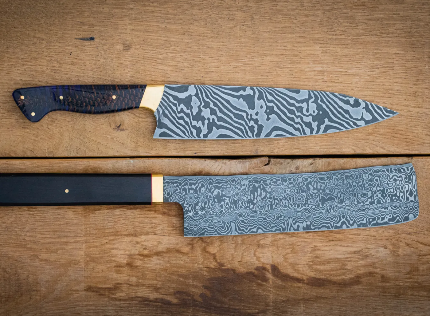 Totale lengte van het mes tot 45 cm. Naast rozen-, golvendamamast behoort ook torsiedamast tot de mogelijkheden. Bij torsiedamast wordt het gloeiende materiaal per hand ‘opgedraaid’ waardoor het een uniek patroon krijgt. Ook behoort het versmeden van een snijlaag van een andere staalsoort tot de mogelijkheden.
