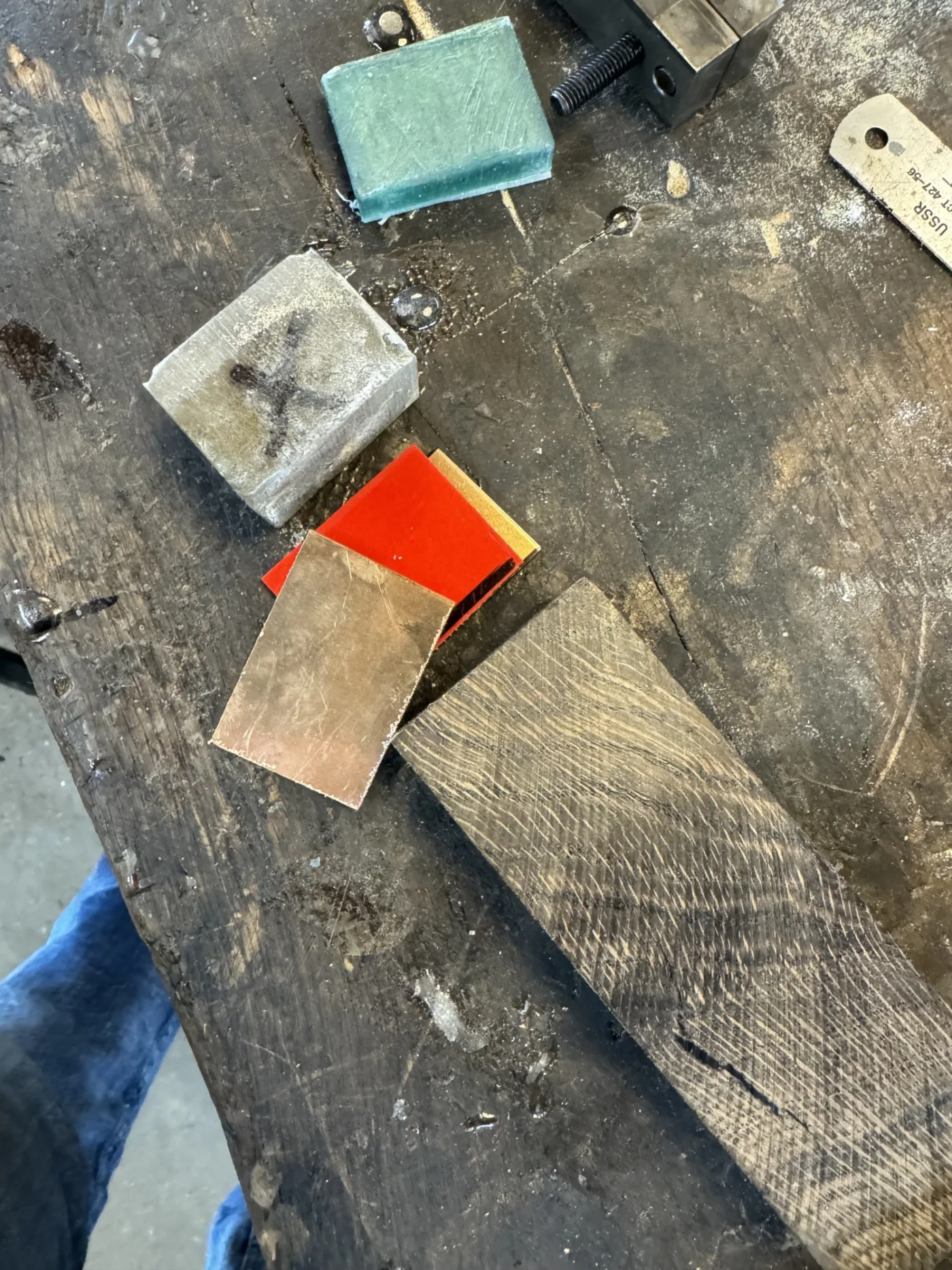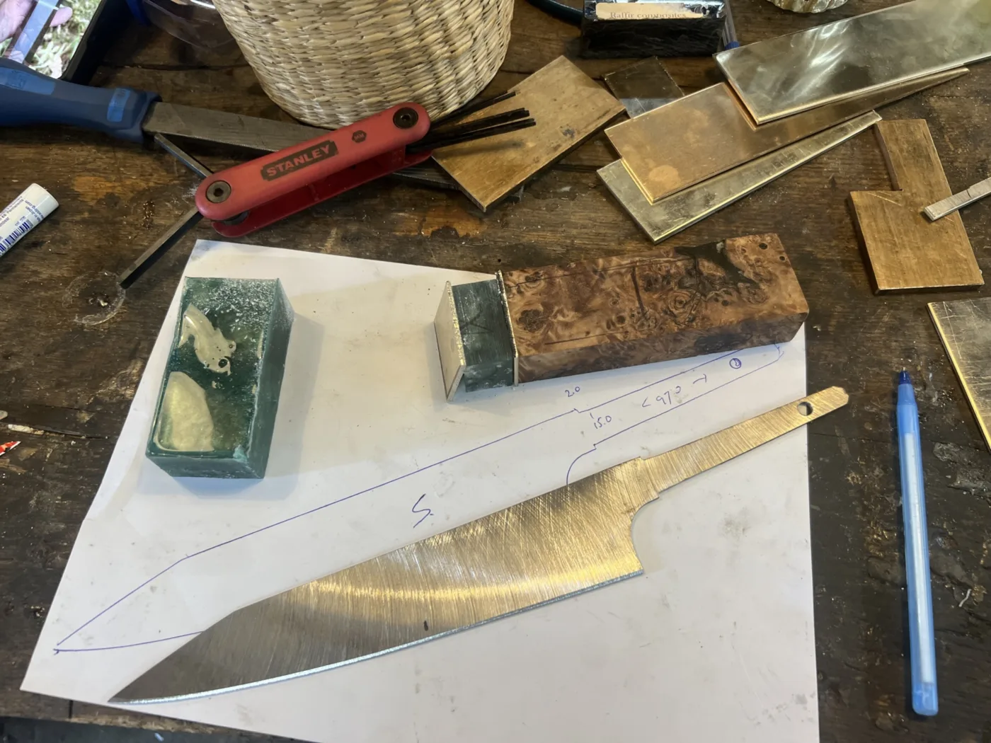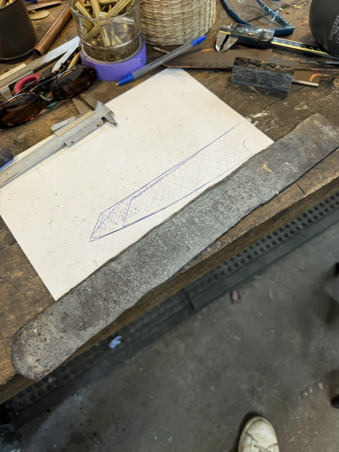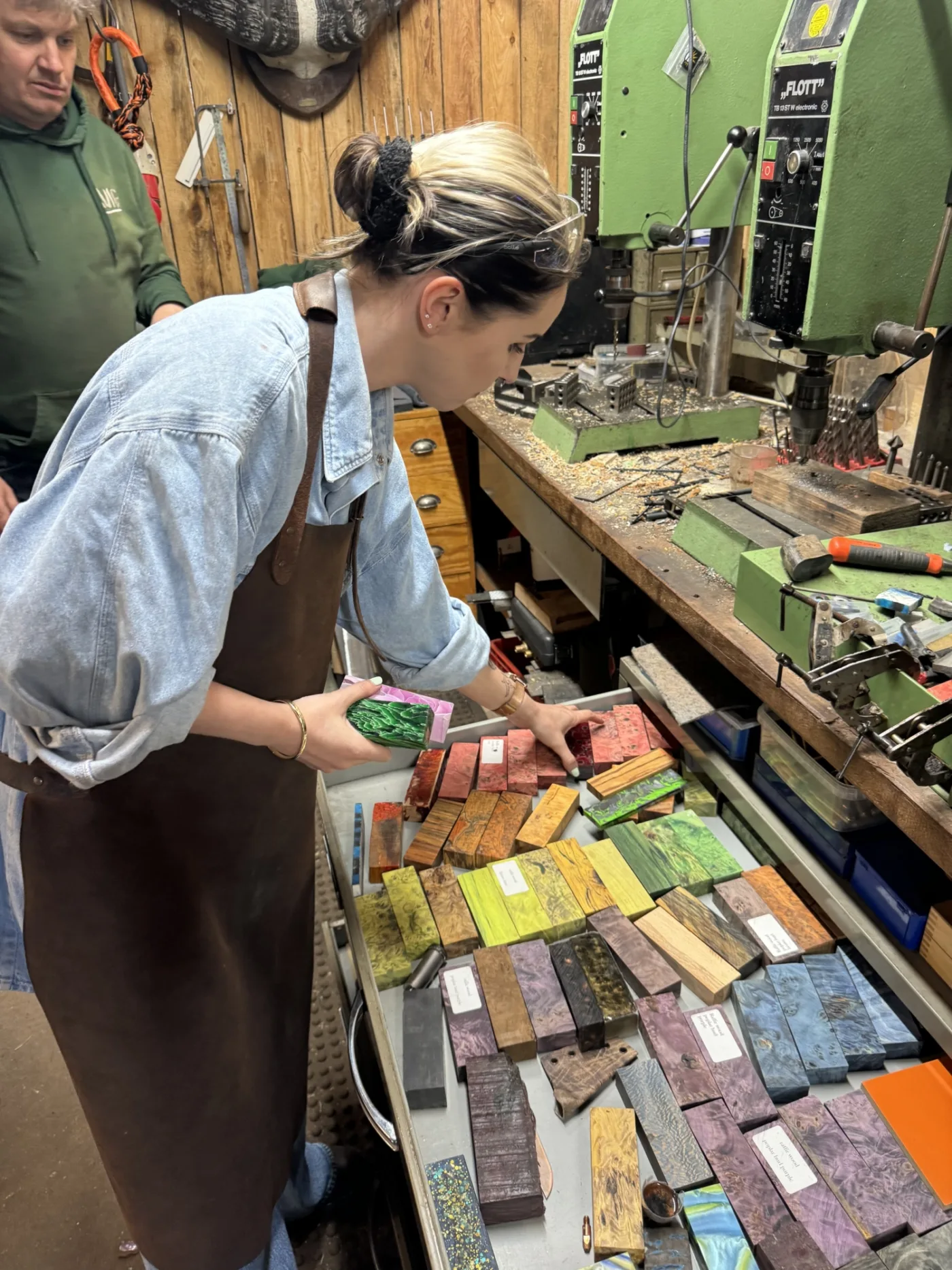 De cursus bestond uit drie dagen waarbij we een ochtend, een middag en een hele dag aan ons unieke mes werkten. Wat dit mes zo uniek maakt is dat Gerwin je door het hele proces neemt waarbij je (zo goed als) alle handelingen zelf uitvoert maar ook volledig je eigen ontwerp creƫert. Je tekent bijvoorbeeld de vorm van het mes dat je wilt smeden zelf (eventueel aan de hand van voorbeelden) en stelt ook volledig je eigen handvat samen. Voor dit tweede trok Gerwin diverse lades open waarin je een brede variatie aan materialen treft; van verschillende soorten hout tot verschillende soorten gestabiliseerde materialen en van mammoetivoor tot gegoten epoxy (waar dochter Zomer haar creativiteit in heeft gestopt).