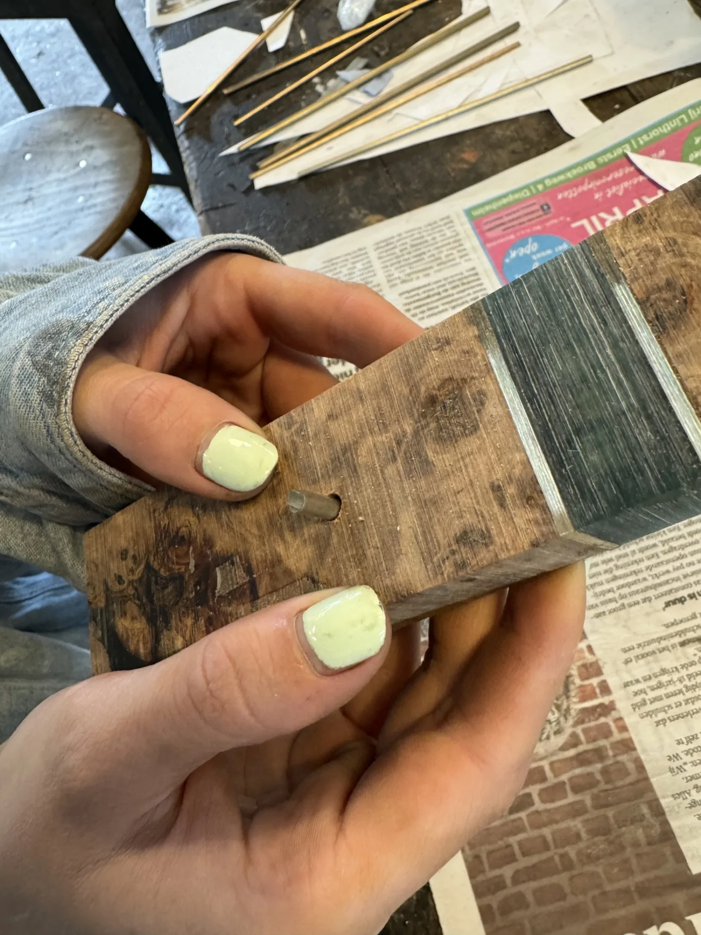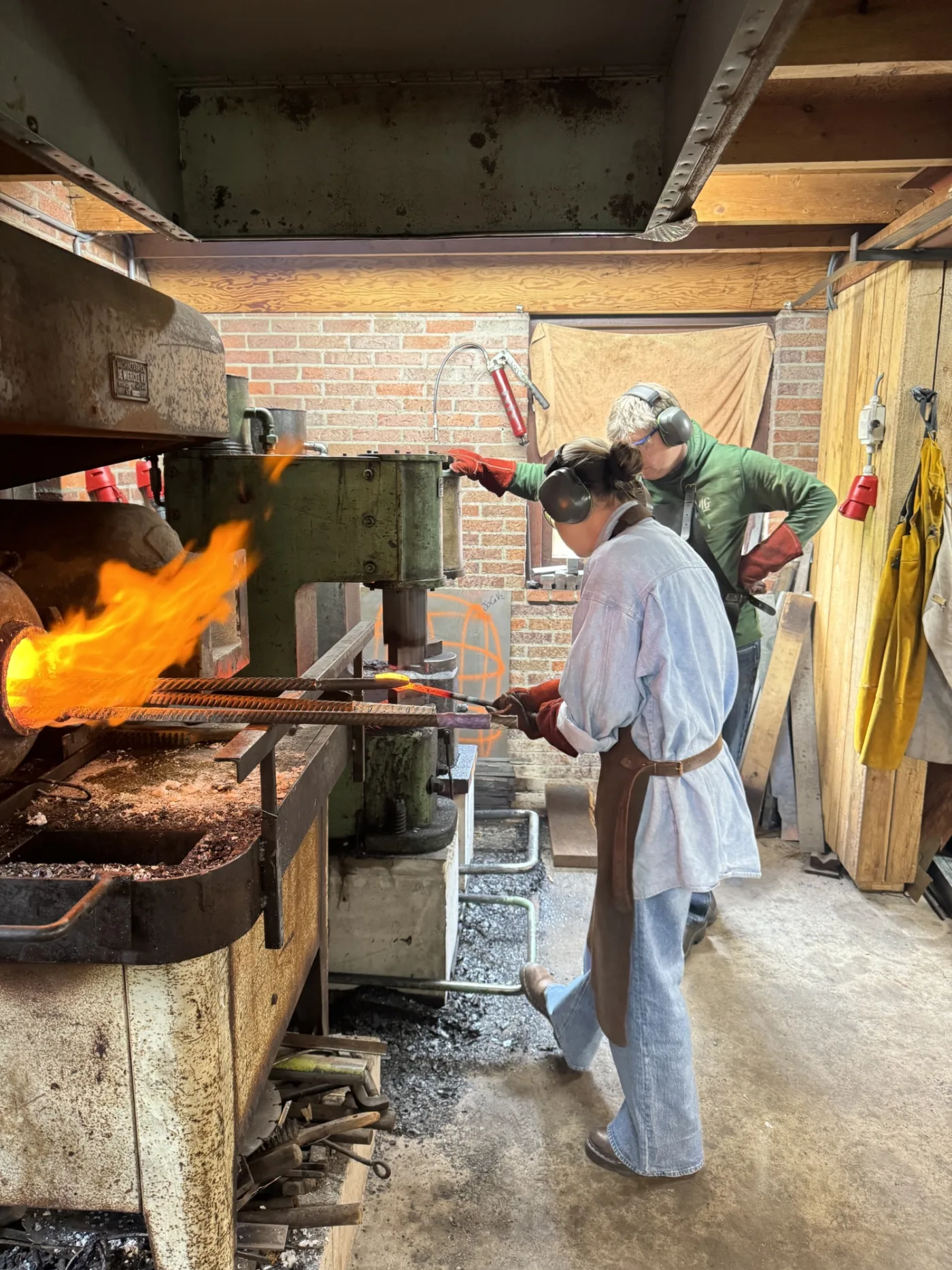 Hiervoor ging we op pad naar Rossum, waar de smederij van RUIG Smeden zich bevindt. Eenmaal aangekomen werden wij hartelijk verwelkomd door smid Gerwin, die ons de komende dagen ging leren een damast mes te smeden. Onder het genot van een lekker kopje koffie leerden we elkaar een beetje kennen en was de sfeer meteen goed. Vervolgens gingen we al gauw aan de slag.